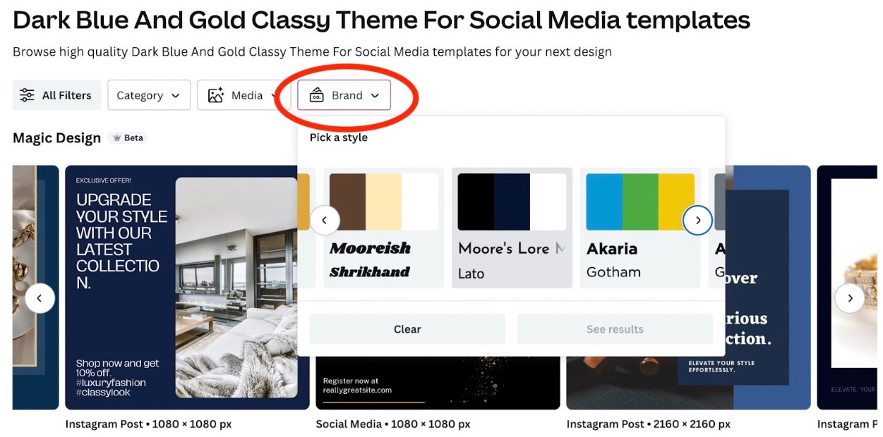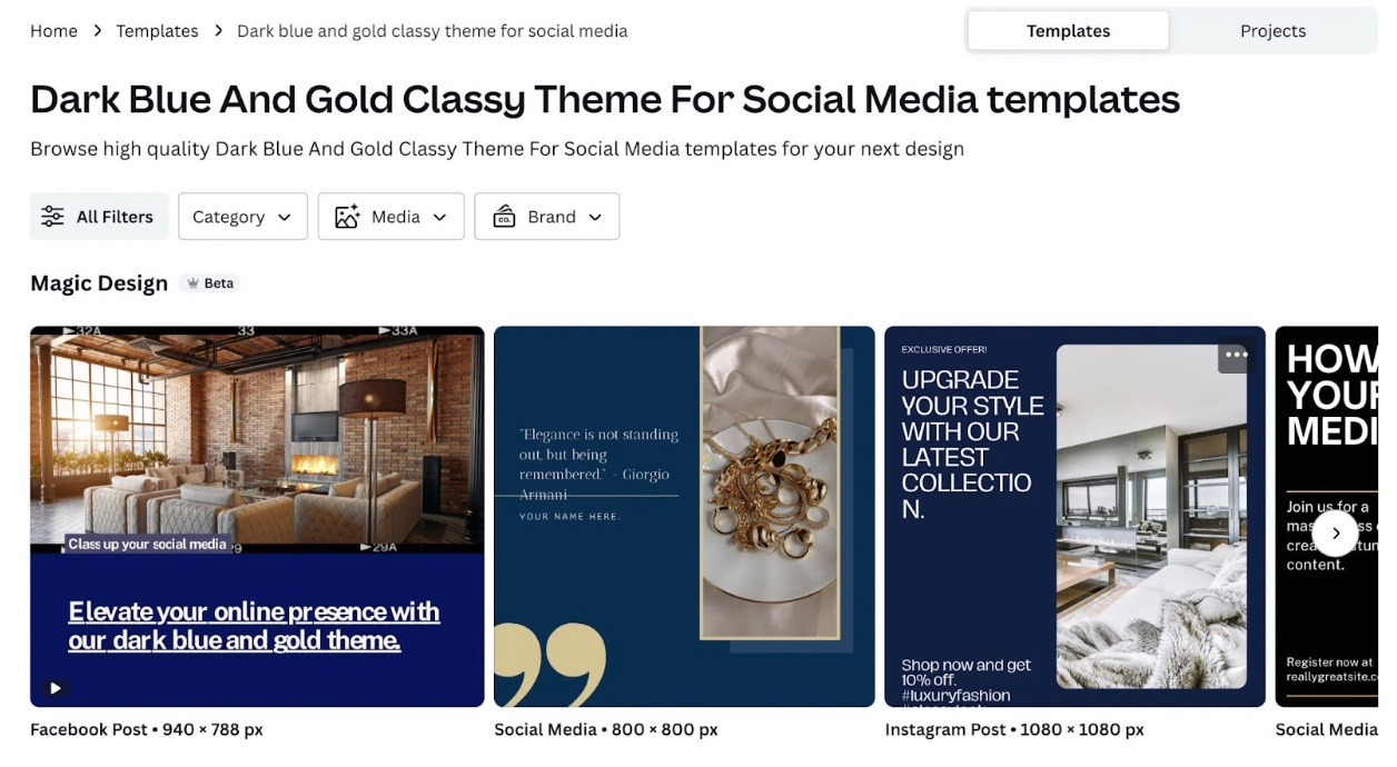 Take this example where I typed "dark blue and gold classy theme for social media templates" and voila! Canva churns out eight different options, including templates for Facebook, Instagram, and Stories. Check it out below…