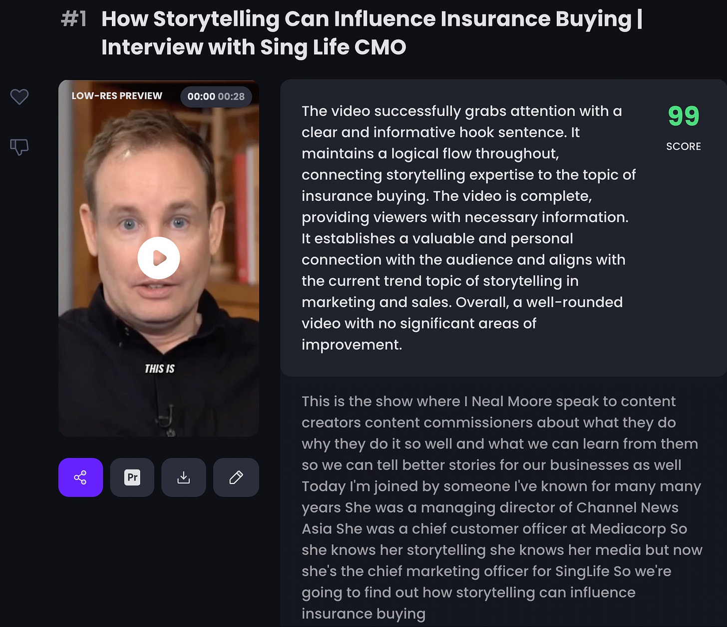 And there’s more - each clip comes with a title, a score, and a succinct summary, providing pointers on what draws the audience in and suggesting ways to improve your reach, such as crafting more compelling calls-to-action for the clip.